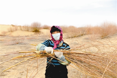 3月19日,在内蒙古鄂尔多斯市达拉特旗官井村,村民收集沙柳种苗。在位于库布其沙漠边缘的鄂尔多斯市达拉特旗官井村,人们为了保家护田,从20世纪90年代起种植沙柳。