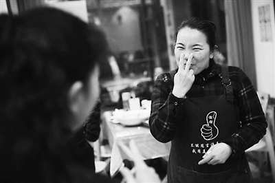 服务员毛毛正在教客人怎么用手语表示“芥末”。