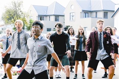 3月20日,在新西兰克赖斯特彻奇,一些中学生在枪击案现场跳起毛利战舞以慰逝者。 新华社记者 卢怀谦 摄