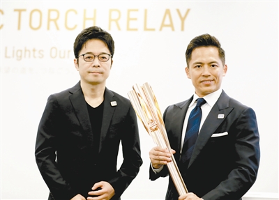 3月20日,东京奥运会圣火传递大使、日本柔道名将野村忠宏(右)与火炬设计师吉冈德仁在发布会上展示火炬样式。