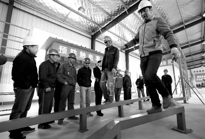 3月21日,在青岛市即墨区安全教育培训体验馆,建筑工人进行平衡木项目体验。