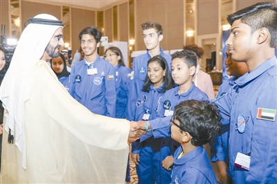 3月19日,在阿联酋阿布扎比,阿联酋副总统兼总理、迪拜酋长穆罕默德(左一)在第二届全球空间大会上与学生握手。新华社/阿联酋通讯社