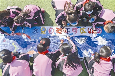 当日是世界水日,各地学校举办形式多样的主题活动,帮助孩子们从小树立爱护环境、节约用水的意识。 新华社发(孙文潭 摄)