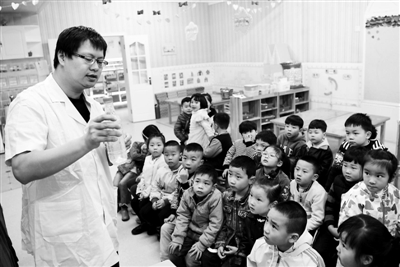 3月21日,在合肥广福花园幼儿园,合肥市包河区环境监测站的工作人员向孩子们介绍水质小知识。