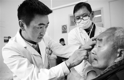 3月18日,宁强县天津医院青木川分院院长张鹏(左)、下派青木川分院副院长凌蓬(中)为患者诊疗。宁强县成立医共体,18个乡镇卫生院均由总院下派一名业务副院长。