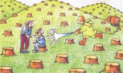 在光秃秃的林场上,伐木工坐在树桩上悠闲地吸烟,消防员朝他们端起了水枪。这不仅是职业习惯,更体现“亡羊补牢”的心境。【土耳其】 卡曼拉