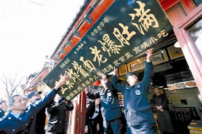 3月22日,执法队员现场拆除打着“老北京”“中华老字号”等旗号的违规牌匾。