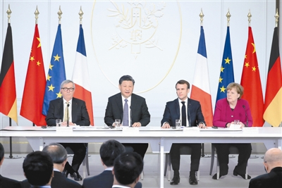 3月26日,国家主席习近平在巴黎同法国总统马克龙一道出席中法全球治理论坛闭幕式。德国总理默克尔、欧盟委员会主席容克应邀出席。 新华社记者 鞠鹏 摄