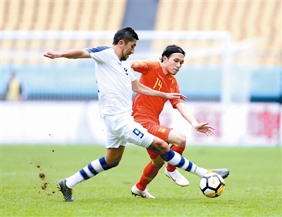 3月25日,中国队球员张修维(右)与乌兹别克斯坦队球员艾哈迈多夫在比赛中拼抢。 新华社发(贾浩成摄)