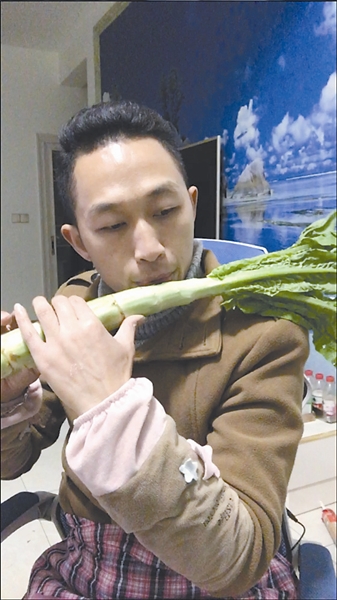 李成建用新做成的莴笋“乐器”吹奏曲子。
