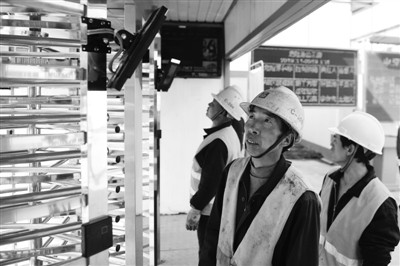 3月26日,工人在实名制通道使用人脸识别技术进入项目工地。