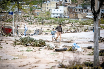 3月26日,在伊朗设拉子,一名男子牵着孩子走在洪水过后的路面上。