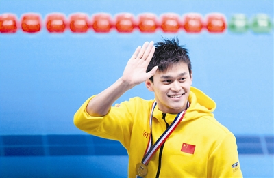 3月27日,孙杨在颁奖仪式后向观众致意。当日,在青岛举行的2019年全国游泳冠军赛暨世锦赛选拔赛男子800米自由泳决赛中,浙江队选手孙杨以7分48秒03的成绩获得冠军。 新华社记者 陶希夷 摄