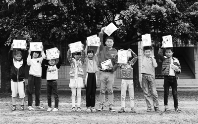 2018年,硕士研究生毕业的王晟参加了广东省时代公益基金会组织的“田埂花开”计划,到赤岭小学洋水岭校区教美术。在他的指导下,该校区第一次有学生在全省的美术比赛中获奖。 图为王晟(右四)和学生们一起展示各自完成的绘画作品。 新华社记者 邓华 摄