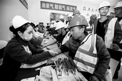 当日,来自武汉大学人民医院及鄂州市中心医院的63名医护人员及志愿者,来到鄂州市中国建筑走马湖水系综合治理工程项目部,为这里的建设工人和村民进行免费体检,并进行疾病预防控制讲解、疑难疾病咨询和健康教育普及活动。新华社记者 肖艺九 摄