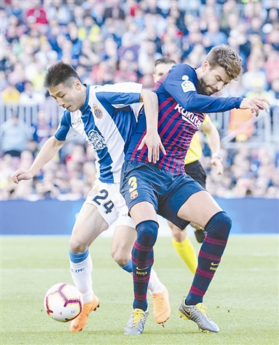 图为巴塞罗那队球员皮克(右)与西班牙人队球员武磊在比赛中。 新华社发(胡安·戈萨摄)
