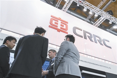4月2日,在德国汉诺威,参观者与工作人员在中车集团展区前交流。