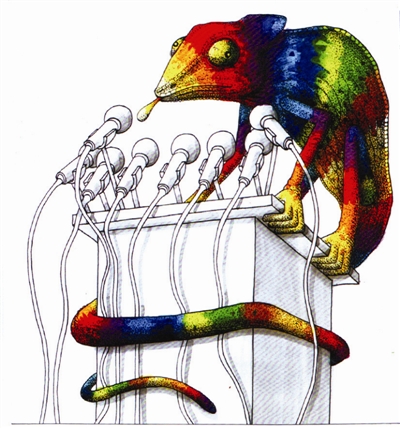 说一个人“擅变”,包括其性格、行为、语言等,故形象地称之为“变色龙”。哈,他做讲演了,可想而知话筒里的真实会有多少?【斯洛伐克】科互契克