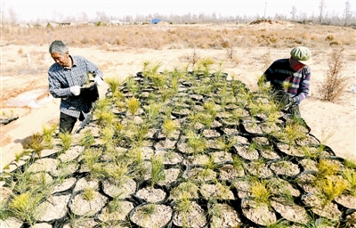 陕西省榆林市靖边县东坑镇毛团村的村民在栽种樟子松树苗(4月4日摄)。