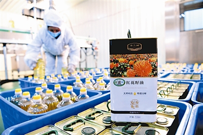 4月7日,新疆察布查尔锡伯自治县红花产业园一企业的工人在整理已灌装好的红花籽油。