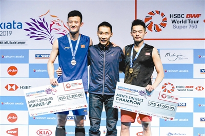 4月7日,谌龙、李宗伟和林丹(从左至右)在颁奖仪式上。 新华社发(张纹综 摄)