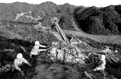 图为4月8日,鹰潭工务段职工正在九景衢铁路梅山一号隧道进行危石巡查,确保全国铁路实施新列车运行图安全。