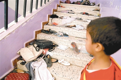 4月8日,在也门萨那,一名男孩在空袭过后站在学校的走廊上。
