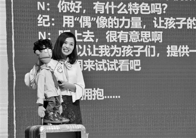 4月10日,木偶表演艺术工作者纪晞宇在比赛现场介绍自己运用特长,在社区中进行公益演出和组织木偶文化亲子活动的经历。