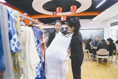 4月11日,在山东德州学院“七点创业谷”,一名大学生正在试穿植物染色衣服。