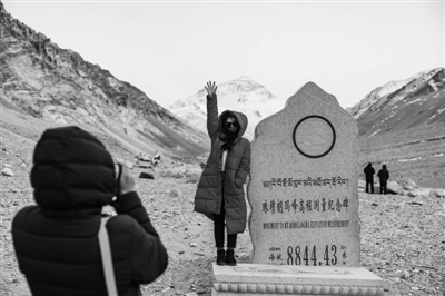 图为日前游客在珠穆朗玛峰脚下拍照留念。当前,珠峰进入旅游旺季,游客最远可抵绒布寺区域。 新华社 孙非 摄