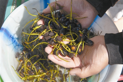 王二猛去年采摘的莲子,用水泡过栽在花盆里,等花开后就可以卖给游客,让他多一份收入。