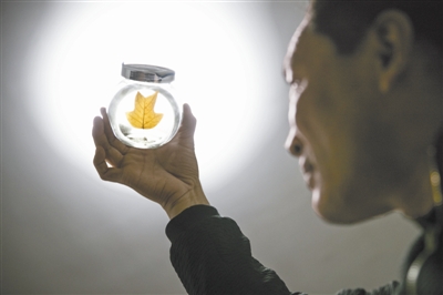 4月11日,天域生态公司养护项目经理朱会营向记者展示药水中存储的树叶标本。这些标本有助于“千年秀林”的后期管护。