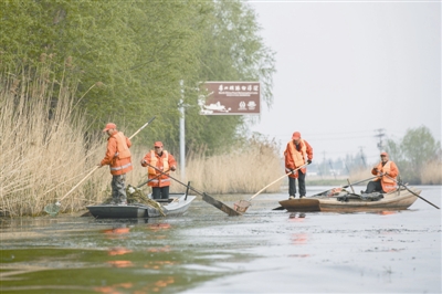 4月9日下午,白洋淀里的环卫工王老槐(左一)和同事们在湖面上打捞漂浮物。自雄安新区成立以来,白洋淀内的生态环境得到了明显改善。