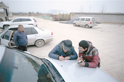4月10日傍晚,金圆睿通公司8号地一标段的负责人高永杰(右二)正在给货车司机结算工钱。“千年秀林”工程给当地带来了不少就业岗位。
