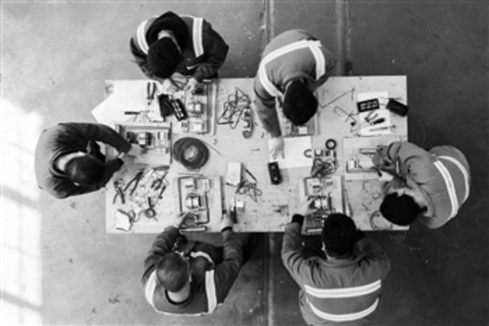 3月26日,浙江宁波舟山港北仑矿石码头分公司机修分部盘内配线技术比武举行。20余名电工按图纸将电器元件连接成手动电机正反转控制回路,考查识图、配线工艺、仪表使用以及电气操作安全等项目,在比武的同时也提高了大家的操作技能。
