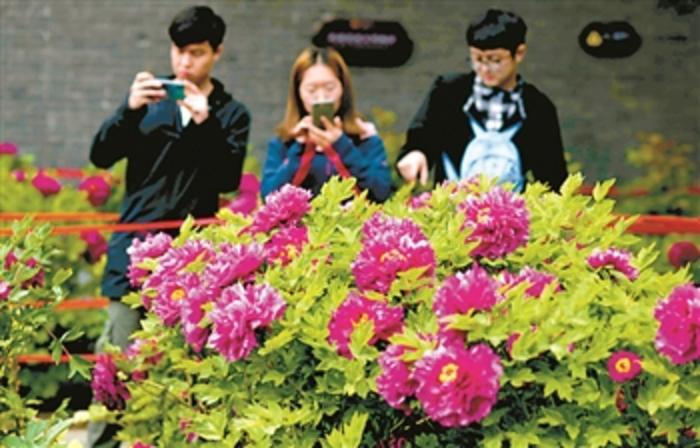 时下,河北石家庄正定荣国府影视基地内的牡丹花次第开放,在春雨的滋润下显得格外晶莹剔透、美丽娇艳。