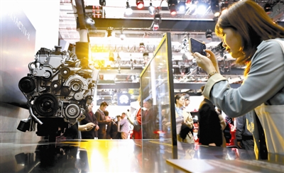 4月16日,参观者用手机拍摄一台汽油发动机。