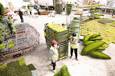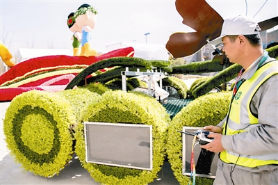 4月13日,北京世园会园区内主要展馆的布展工作已基本完成,室外展园的布置工作也进入最后的精修阶段。而在园区西侧一个临时搭建的工作车间,10辆由鲜活植物打造的“生态花车”尤为引人注意。
