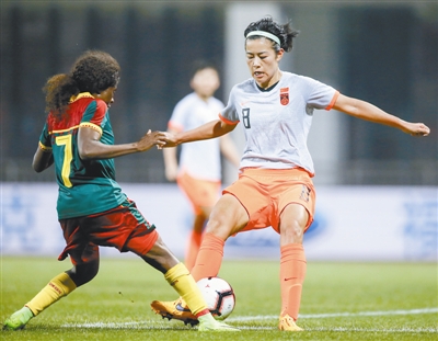 女足四国赛决赛,中国队球员李佳悦(右)与喀麦隆球员拼抢。新华社记者 丁旭 摄