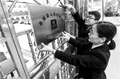 4月23日,河北省阜城县人民检察院检察官在一家企业门口挂“民营企业法律服务站”的牌子。