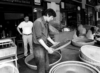 4月23日,一名茶商在新昌中国茶市筛茶。