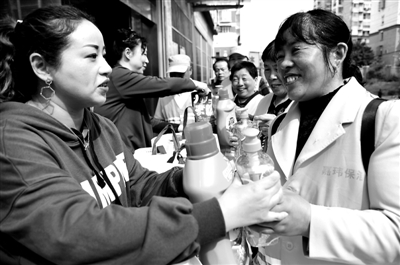 4月24日,社区工作人员为街巷保洁员送上生活用品。“五一”国际劳动节临近,江苏省镇江市润州区七里甸街道二道巷社区向辖区街巷保洁员赠送洗衣液、洗发水等个人生活保洁用品,为城市美容师们送上节日的问候与关怀。石玉成 摄/中新社