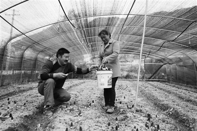 ▲团结村群众余应太(左)和妻子在自家承包的大棚里收割羊肚菌。