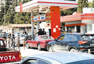 4月23日,在叙利亚大马士革,车辆在加油站前排队加油。