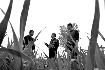 4月24日,农技专家(中)在固安县彭村乡荆垡营东村的田间向村民介绍经验。