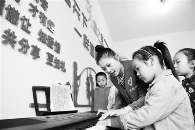4月23日,志愿者在滦州市滦河街道办事处“四点半课堂”上带领小学生弹电子琴。