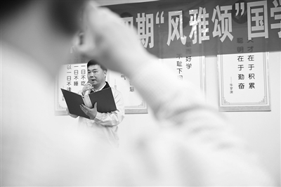 图为一名职工正在诵读经典。