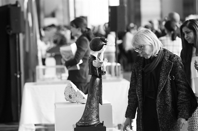 4月25日,在瑞士日内瓦万国宫,人们参观中国元素的设计作品。当日,为欢庆联合国中文日,“融古铸今——古丝路建筑和当代设计作品展”在联合国日内瓦办事处所在地万国宫拉开帷幕,展示了中国文化的魅力。 新华社记者 徐金泉 摄