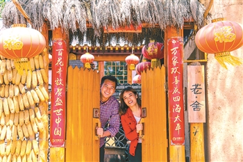 4月30日,游客在河北省永清县东义和村一家民宿门口合影。