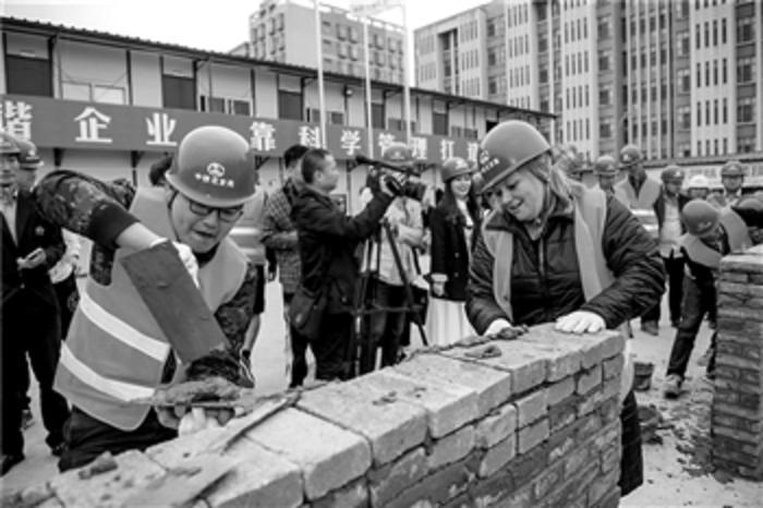 大赛将竞技与娱乐相结合,设同心砌墙、趣味砌砖等趣味比赛项目,来自合肥加拿大国际学校的外籍教师与建筑工人同场竞技,让竞赛增添“国际范儿”。